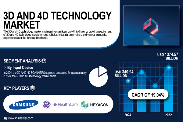 According to the SNS Insider,“The 3D and 4D Technology Market size was valued at USD 340.94 Billion in 2024 and is projected to reach USD 1374.57 Billion by 2032, growing at a CAGR of 19.04% during 2025-2032.”