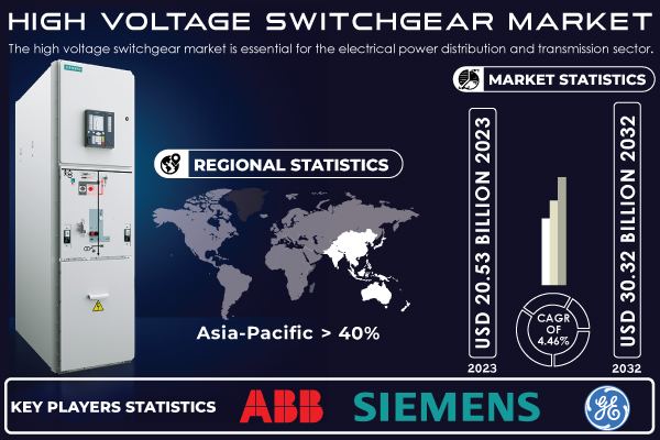 The High Voltage Switchgear Market was valued at USD 20.53 billion in 2023 and is projected to reach USD 30.32 billion by 2032, growing at a CAGR of 4.46% from 2024 to 2032.