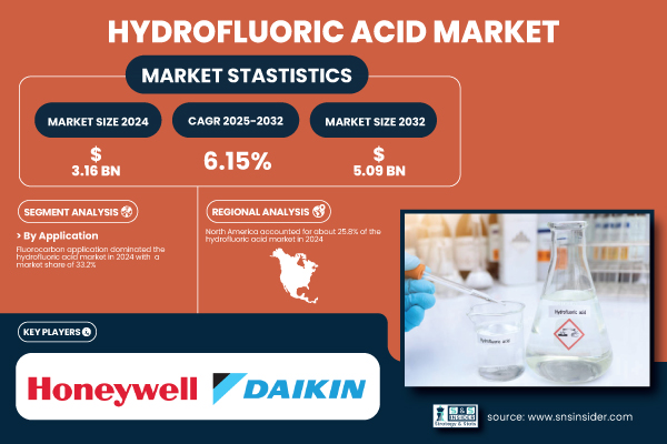 Austin, June 11, 2025 (GLOBE NEWSWIRE) — The global hydrofluoric acid market was valued at USD 3.16 billion in 2024 and is projected to reach USD 5.09 billion by 2032, expanding at a compound annual growth rate (CAGR) of 6.15% from 2025 to 2032.
