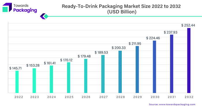 The global ready-to-drink packaging market was valued at USD 145.71 billion in 2023 and is projected to surpass around USD 252.44 billion by 2032.