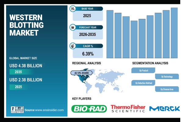 Austin, April 14, 2026 (GLOBE NEWSWIRE) — According to SNS Insider, The Western Blotting Market size is valued at USD 2.38 Billion in 2025 and is projected to reach USD 4.38 Billion by 2035, growing at a CAGR of 6.39% during the forecast period 2026–2035.
